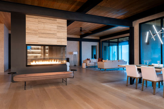 Inside, the home is designed for comfort and elevated daily living. The chef’s kitchen pairs floating shelves with dramatic lighting, while the dining area frames art and light as focal points. In the primary suite, white oak floors and a white fir ceiling complement a fireplace to form a serene retreat, and the powder room delivers a bold impression with warm woods and sculptural fixtures. Vista Bella embodies